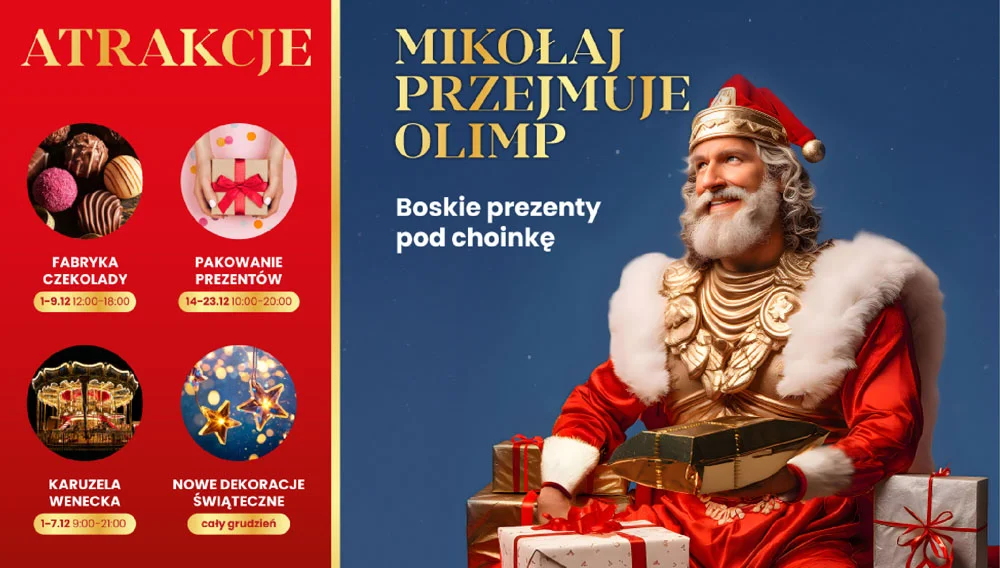 Pierwsze zmiany zauważamy już teraz! W oczekiwaniu na nadchodzące święta Bożego Narodzenia Galeria Olimpia oferuje moc atrakcji pod hasłem „Mikołaj przejmuje Olimp. Boskie prezenty pod choinkę”: