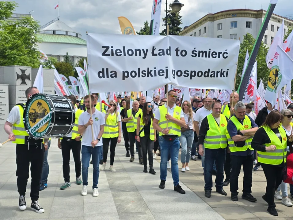 „Zielony Ład – to śmierć polskiej gospodarki” czy „Transformacja – nie likwidacja” transparenty z takim hasłami, a także wiele innych, przywieźli protestujący związkowcy do Warszawy, aby zaprotestować przeciwko polityce „Zielonego Ładu”. Na ulicach stolicy pojawiło się w sumie kilka tysięcy związkowców, którzy przemaszerowali pod siedzibę Sejmu RP. Do Warszawy przyjechali przedstawiciele przemysłu hutniczego, stalowego, motoryzacyjnego, chemicznego, górniczego i wytwórczego. Liczną delegację miał również Bełchatów, bo na manifestacji pojawili się również związkowcy z kopalni i elektrowni, a także spółek zależnych PGE m.in. MZZ „Odkrywka” KWB Bełchatów, WZZ „Sierpień” 80 KWB Bełchatów, MZZP Elektrowni Bełchatów.